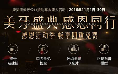 “感恩”——因为有你,心怀感激。所谓的“幸福”就是有一颗感恩的心,一个健康的身体,一份称心的工作,一位深爱你的爱人,一帮信赖的朋友"。 康贝佳感谢您一直以来的关注! 感谢您一如既往的支持!为了感恩市民的支持,康贝佳特别开展了“美牙盛典·感恩同行”活动。